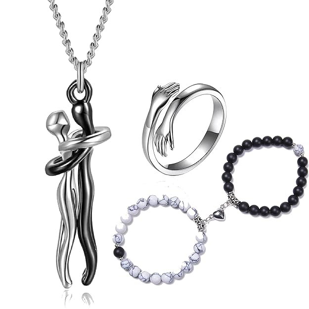 Fashion Frill Silver Hug Chain Pendant For Women Stainless Steel Silver Hug Ring With Beads Couple Bracelet For Women Men Boys Friendship Bracelet Jewellery Combo